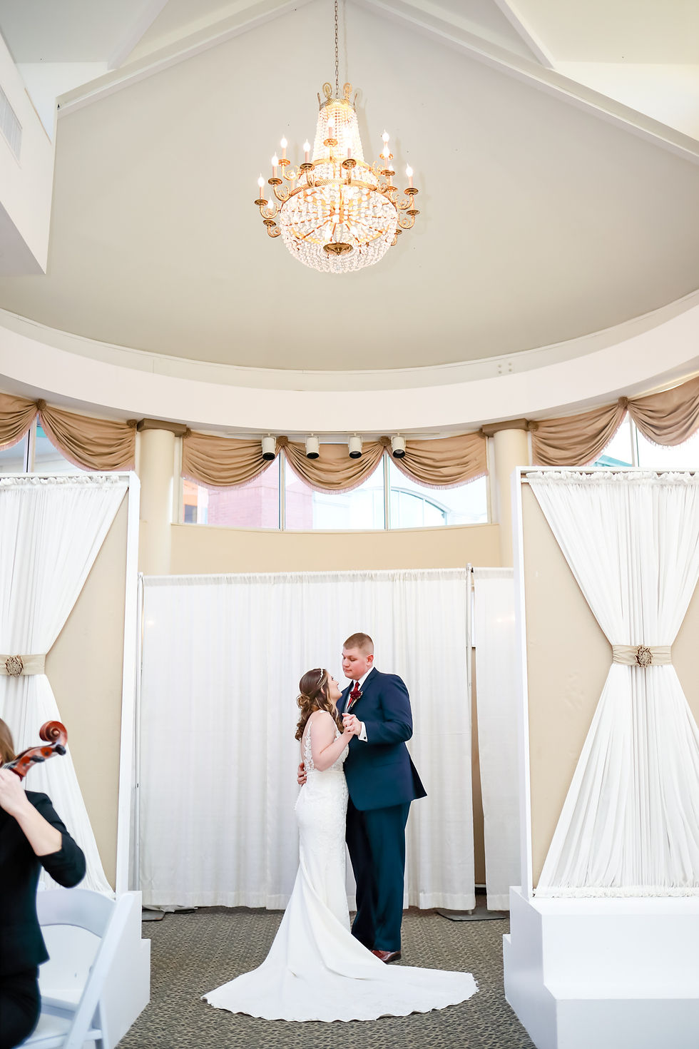 Due to unforeseen weather conditions, the dance had to be moved last minute indoors. That didn't stop this bride and groom from having a very romantic moment while the Blue Line Quartet beautifully played "Flightless Bird", from the movie Twilight.